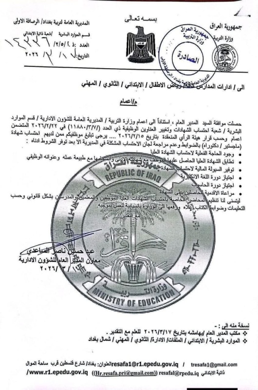 حددت مديرية تربية بغداد/ الرصافة الأولى، ضوابط جديدة لاحتساب الشهادات العليا (الماجستير والدكتوراه) للموظفين والكوادر التدريسية.