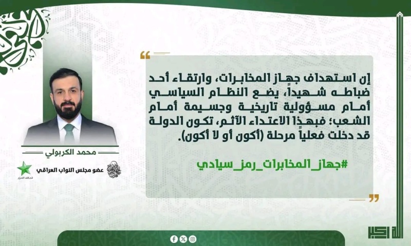 وقال الكربولي في منشور على حسابه بمنصة (إكس)، تابعتها "بغداد اليوم"، أن "استهداف جهاز المخابرات وارتقاء أحد ضباطه شهيداً يضع النظام السياسي أمام مسؤولية تاريخية وجسيمة أمام الشعب".