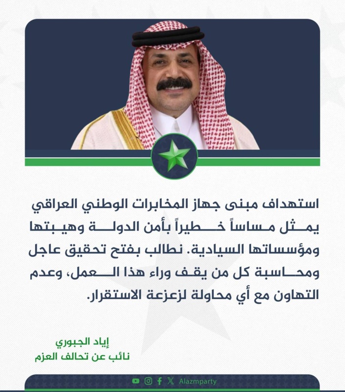 وقال الجبوري في منشور على حسابه بمنصة (إكس)، أن: "استهداف مبنى جهاز المخابرات الوطني العراقي يمثل مساساً خطيراً بأمن الدولة وهيبتها ومؤسساتها السيادية".
