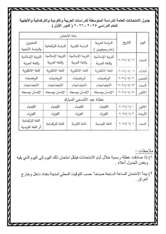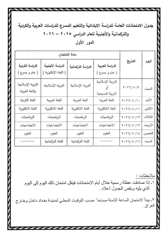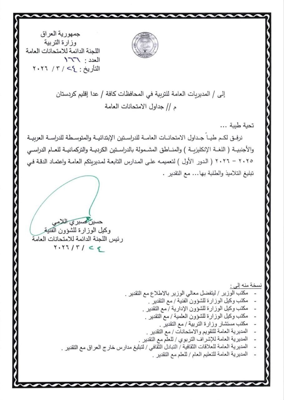 بغداد اليوم - بغداد أعلنت وزارة التربية، اليوم الثلاثاء ( 24 آذار 2026 )، جداول الامتحانات العامة للدراسة الابتدائية والمتوسطة للعام الدراسي (2025-2026) / الدور الاول.