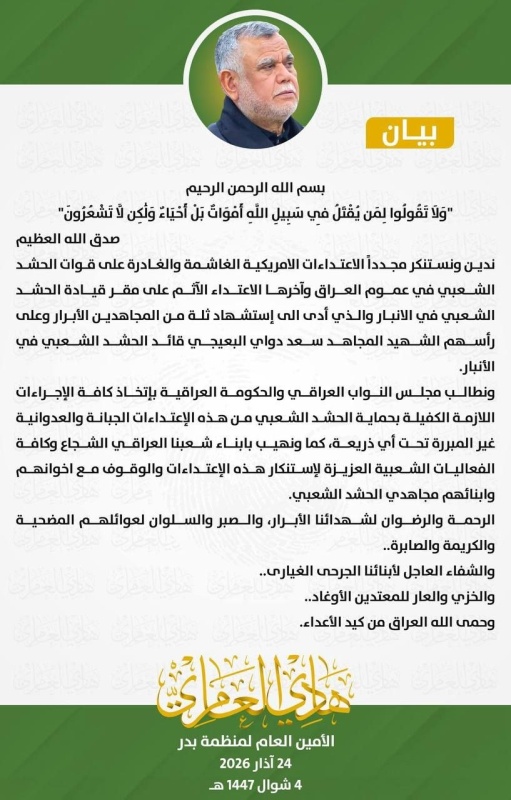 طالب الأمين العام لمنظمة بدر هادي العامري، اليوم الثلاثاء ( 24 آذار 2026 )، الحكومة العراقية ومجلس النواب باتخاذ إجراءات عاجلة لحماية مقرات الحشد الشعبي من الاعتداءات الخارجية، وذلك في أعقاب الهجوم الأخير الذي استهدف مقر قيادة الحشد في محافظة الأنبار وأسفر عن استشهاد عدد من المجاهدين الأبرار.