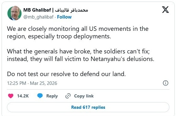 علق رئيس مجلس النواب الإيراني محمد باقر قاليباف، اليوم الاربعاء ( 25 آذار 2026 )، على الانباء المتعلقة بقدوم قوات برية أمريكية الى الشرق الأوسط والمتجهة تحديدا الى مضيق هرمز.