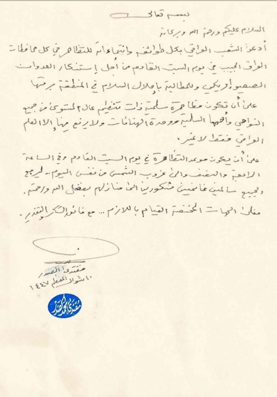 واشار الى أن "موعد التظاهرة يكون في يوم السبت القادم وفي الساعة الرابعة والنصف والى غروب الشمس من نفس اليوم، ليرجع الجميع سالمين غانمين مشكورين الى منازلهم ".