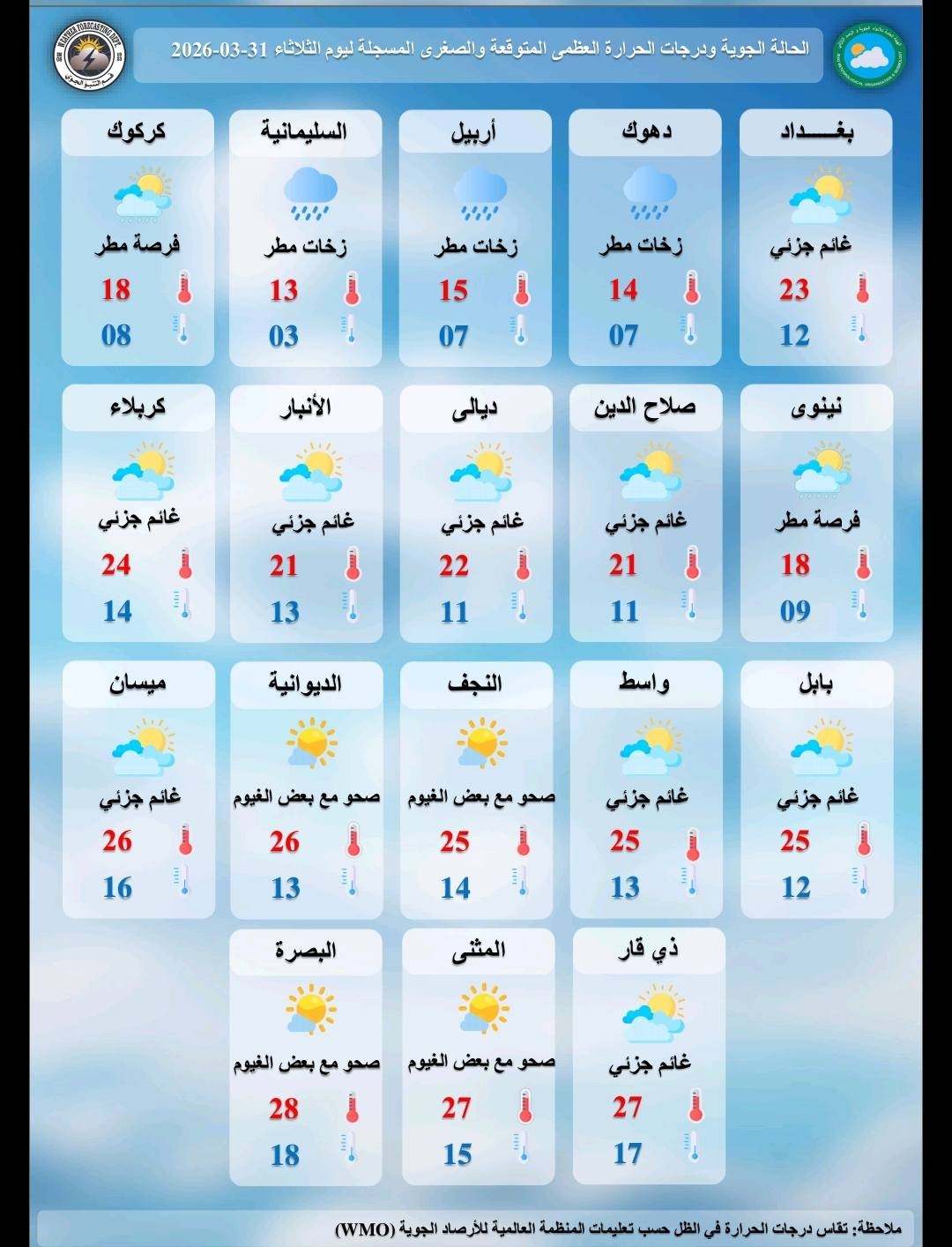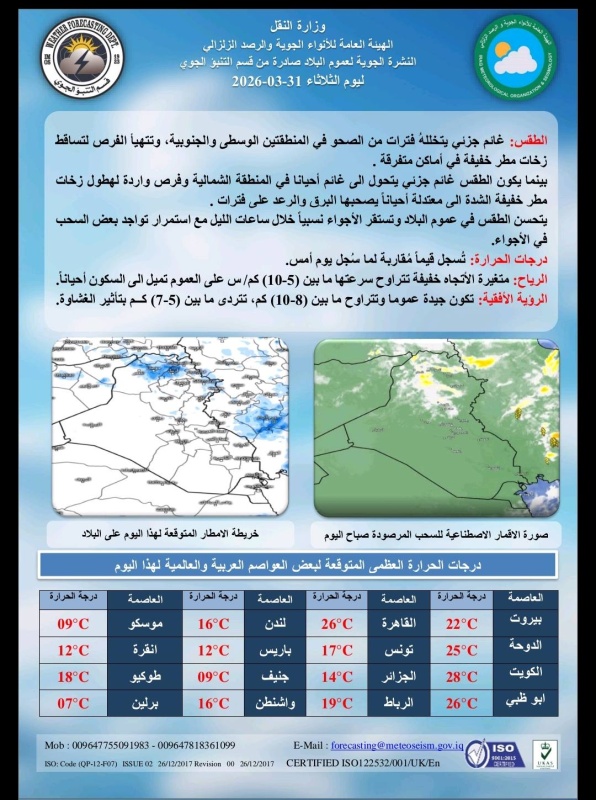 توقعت هيئة الأنواء الجوية، اليوم الثلاثاء ( 31 آذار 2026 )، أن يكون الطقس متقلب، اذ يكون صحواً وغائماً ترافقه فرص هطول امطار خفيفة في أماكن متفرقة، حيث يتحسن في عموم البلاد، بينما تستقر الأجواء نسبياً خلال ساعات الليل مع استمرار تواجد بعض السحب في الأجواء، فيما تسجل الحرارة درجات مُقاربة لما سجلته يوم أمس.