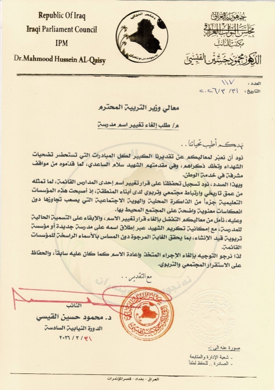 وبحسب ما جاء في الوثيقة ادناه والتي وردت لـ"بغداد اليوم" فأن القيسي دعا يوم الثلاثاء الماضي ( 31 اذار 2026 )، إلى الإبقاء على تسمية المدرسة الحالية، مراعاةً لبعدها التاريخي والاجتماعي.