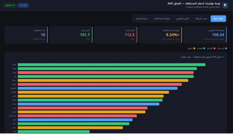 وأضاف مشيراً الى اللوحة ادناه، أن "هذه اللوحة التفاعلية تقدم قراءة رقمية دقيقة لمسار الأسعار شهريًا خلال عام 2025 بحسب السلعة وبحسب المحافظة وبحسب المناطق، وتتيح تحليل التحولات التي مر بها الاقتصاد العراقي، خصوصًا في ظل تسجيل فترات من التباطؤ وحتى الانكماش التضخمي خلال النصف الثاني من العام".