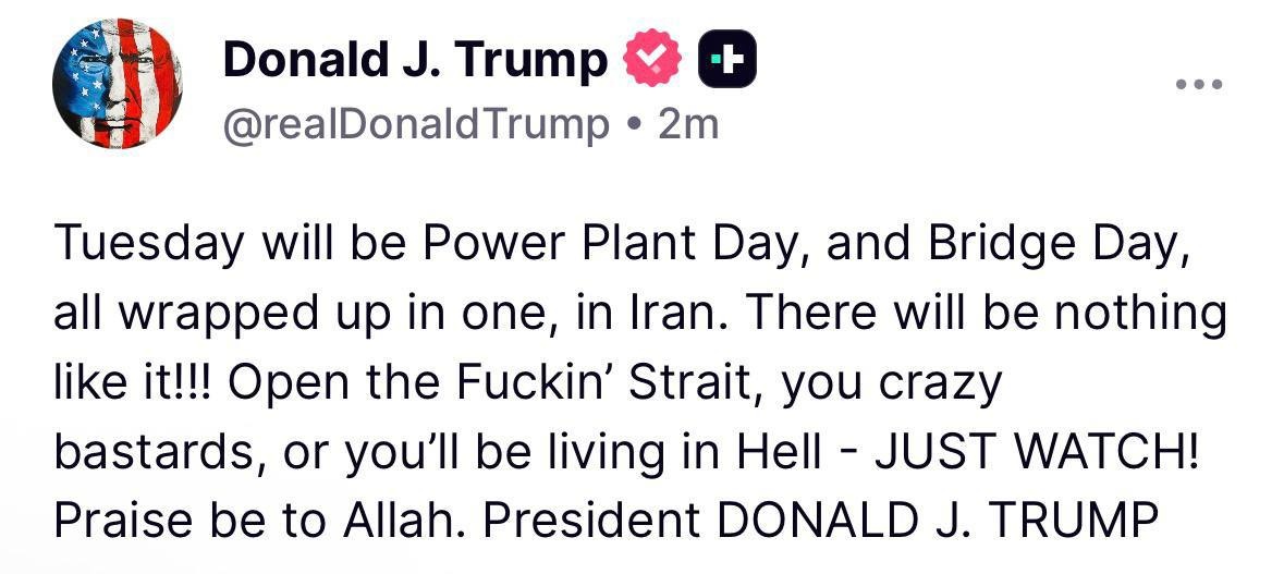 وكتب ترامب في تغريدة جديدة على منصة "تروث سوشيال"، وتابعتها "بغداد اليوم"، أن "يوم الثلاثاء سيكون يوم محطات الطاقة، ويوم الجسور، كل ذلك في يوم واحد في إيران".