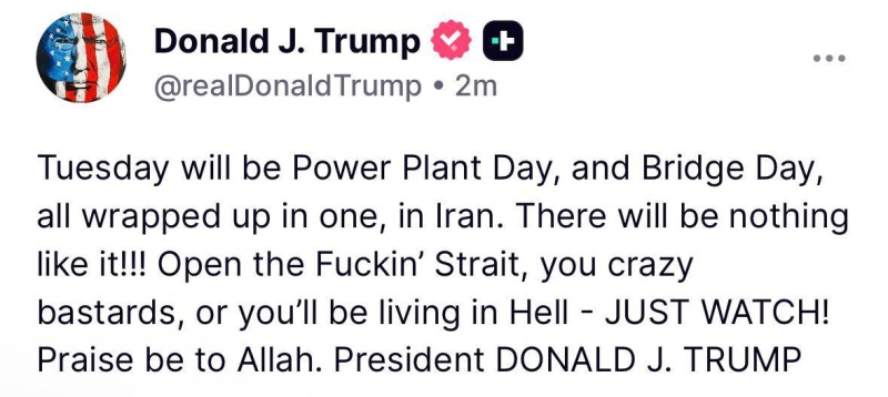 قال الرئيس الأمريكي دونالد ترامب، اليوم الأحد ( 5 نيسان 2026 )، إن الثلاثاء المقبل سيكون يوم استهداف محطات الكهرباء والجسور في ايران.