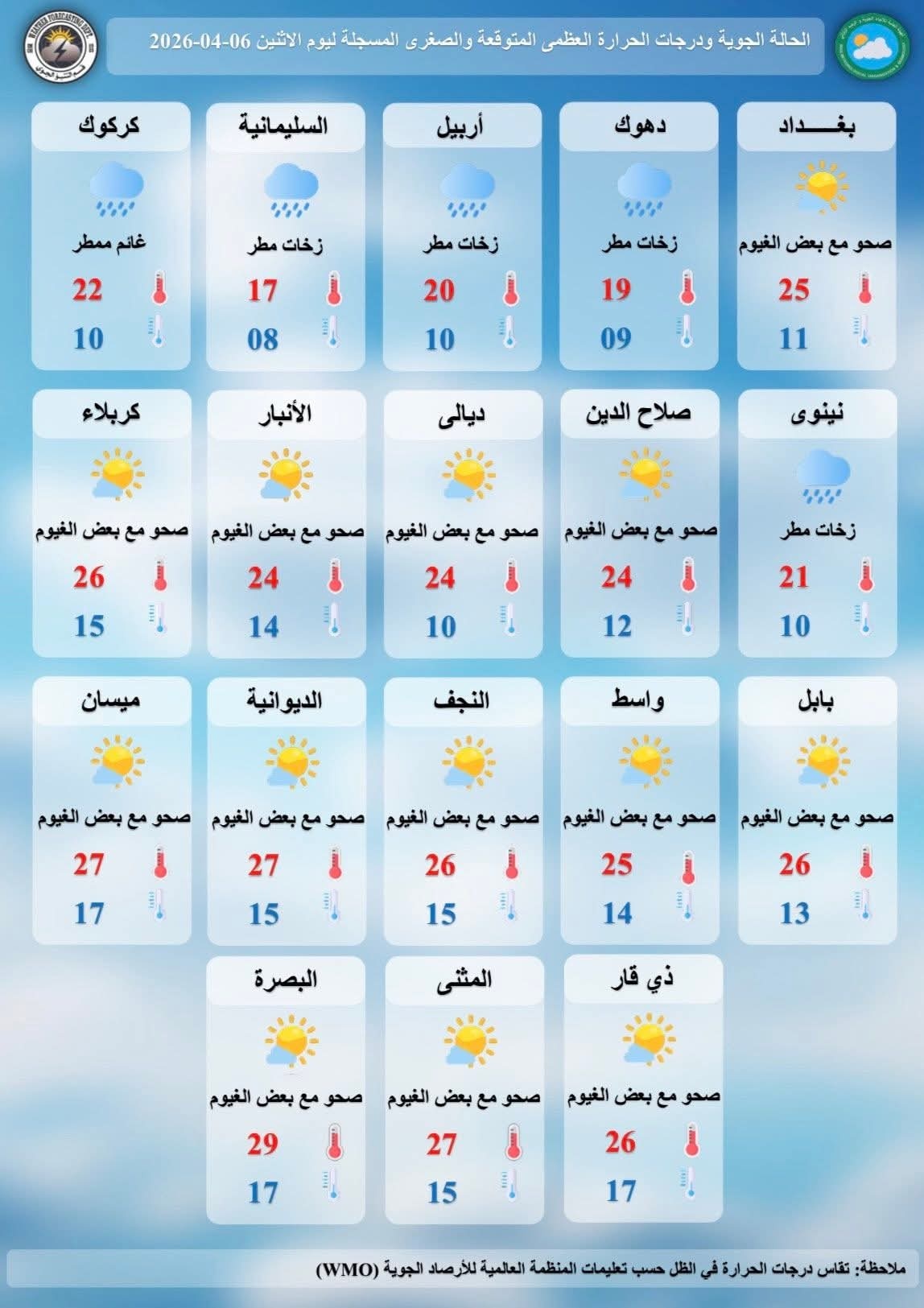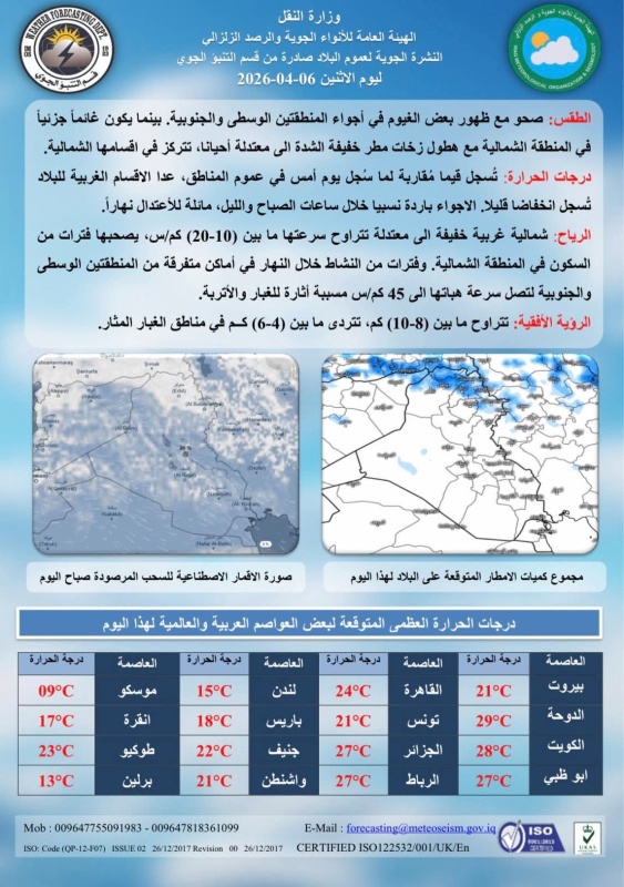 توقعت هيئة الأنواء الجوية، اليوم الإثنين ( 6 نيسان 2026 )، طقساً صحواً إلى غائم جزئياً، مع أمطار خفيفة شمالاً، ودرجات حرارة مقاربة ليوم أمس مع انخفاض طفيف غرباً، وأجواء باردة صباحاً ومعتدلة نهاراً.