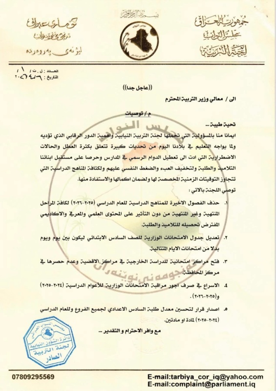 أوصت لجنة التربية النيابية، اليوم الإثنين ( 6 نيسان 2026 )، بعدة خطوات هامة للعام الدراسي الحالي، تهدف إلى تخفيف الضغط على التلاميذ والطلبة دون الإضرار بالمحتوى العلمي والمعرفي.