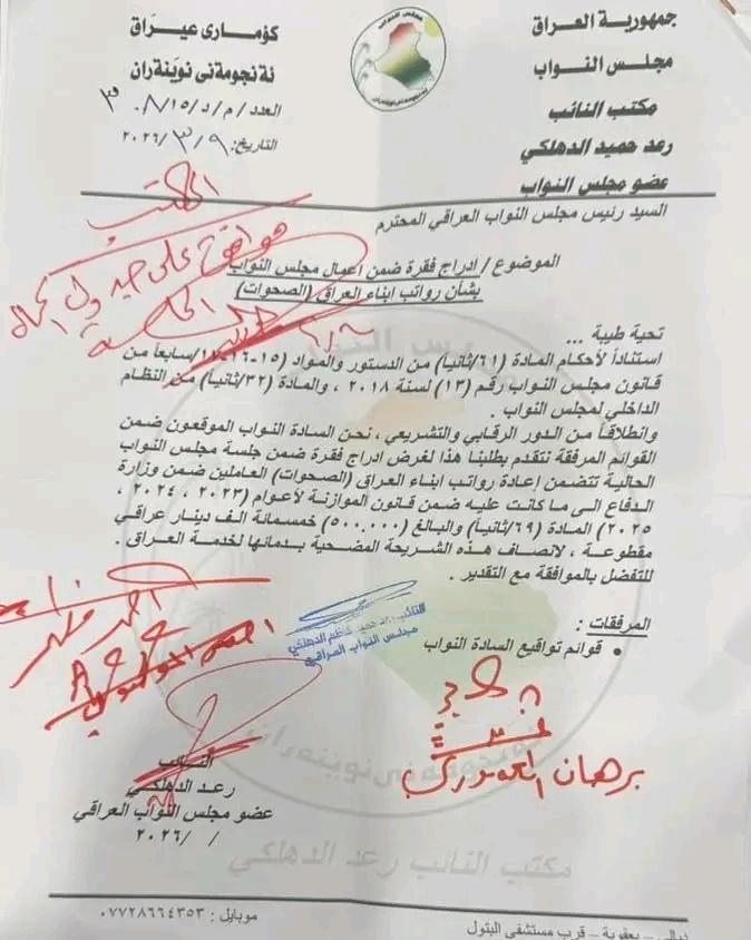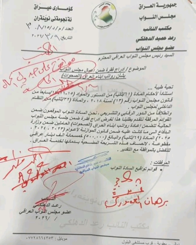 وأشارت وثيقة حصلت عليها "بغداد اليوم"، الى طلب النائب الدهلكي لإستحصال موافقة رئاسة مجلس النواب، على "إدراج فقرة ضمن جلسة مجلس النواب تتضمن إعادة رواتب (الصحوات) العاملين ضمن وزارة الدفاع إلى ما كانت عليه ضمن قانون الموازنة لأعوام (2023 - 2024 - 2025)، والبالغ (500 ألف دينار) مقطوعة، لإنصاف هذه الشريحة المضحية".