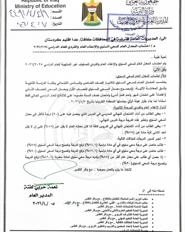 أعلنت وزارة التربية، اليوم الثلاثاء ( 7 نيسان 2026 )، ضوابط الإعفاء العام والفردي لطلبة المراحل غير المنتهية للعام الدراسي 2025-2026، إلى جانب آلية احتساب المعدل العام للسعي السنوي.