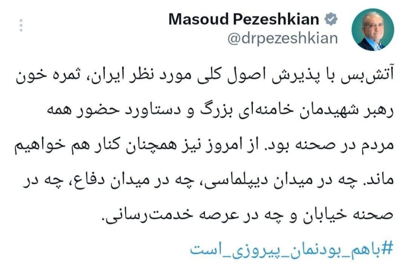 وكتب بزشكيان في تغريدة على منصة "إكس"، تابعتها "بغداد اليوم"، إن "وقف إطلاق النار، بقبول المبادئ العامة التي ترغب بها إيران، هو ثمرة دماء شهيدنا العظيم خامنئي، وإنجازٌ لتضامن جميع أبناء الشعب".