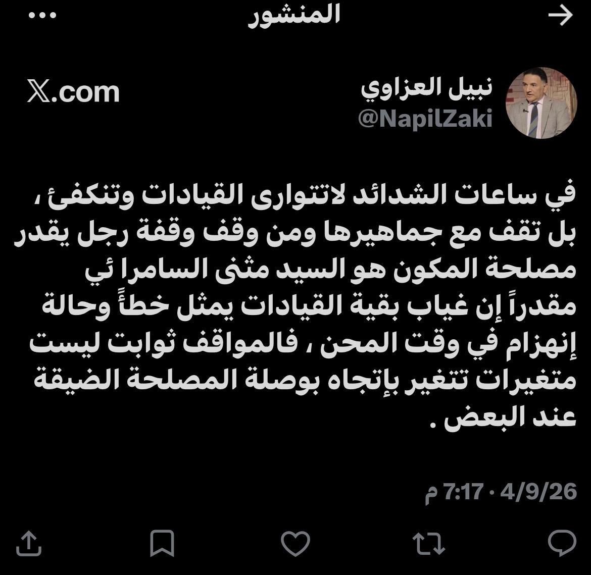 أشاد المحلل السياسي، نبيل العزاوي، اليوم الخميس ( 9 نيسان 2026)، برئيس تحالف العزم مثنى السامرائي، مبينا ان القيادات في ساعات الشدائد لا تتوارى وتنكفئ.