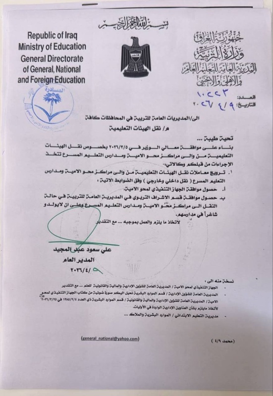 أعلن النائب عن تحالف العزم، محمود القيسي، ( 9 نيسان 2026 )، عن موافقة وزارة التربية على نقل الهيئات التعليمية من وإلى مراكز محو الأمية ومدارس التعليم المسرّع (نقل داخلي وخارجي).