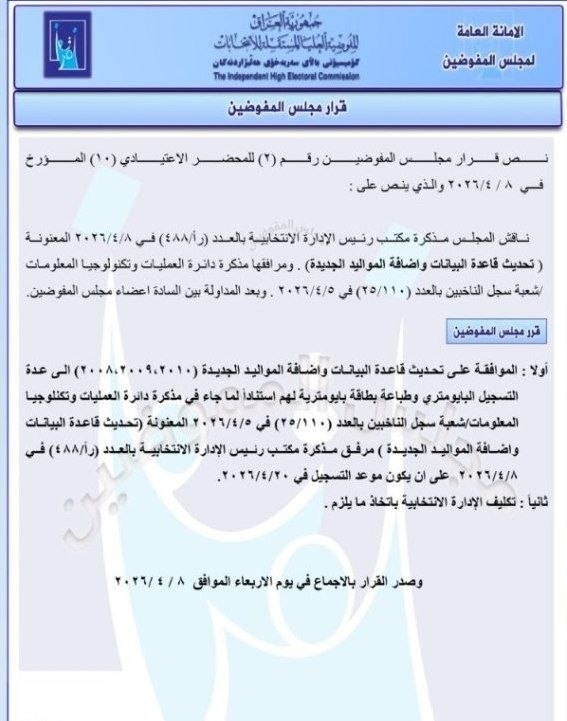 أعلنت مفوضية الانتخابات، اليوم الاحد ( 12 نيسان 2026 )، الموافقة على إضافة مواليد (2008، 2009، 2010) الى قاعدة التسجيل البايومتري.