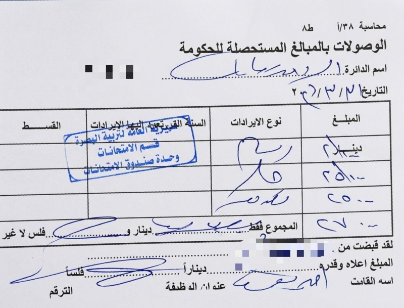 وأضافوا أنهم قاموا بجلب الوثائق وتسليمها إلى قسم الامتحانات في مديرية التربية قبل نهاية شهر آذار الماضي لغرض المصادقة، إلا أنها لم تُنجز حتى الآن، وسط أنباء عن ضياعها بحسب ما أُبلغوا من بعض الموظفين، رغم استيفاء القسم رسوماً مالية بلغت 27 ألف دينار عن كل وثيقة".