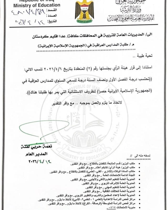 أقرّت وزارة التربية، اليوم الثلاثاء ( 14 نيسان 2026 )، إجراءات استثنائية لدعم طلبة المدارس العراقية بالجمهورية الاسلامية في ايران.