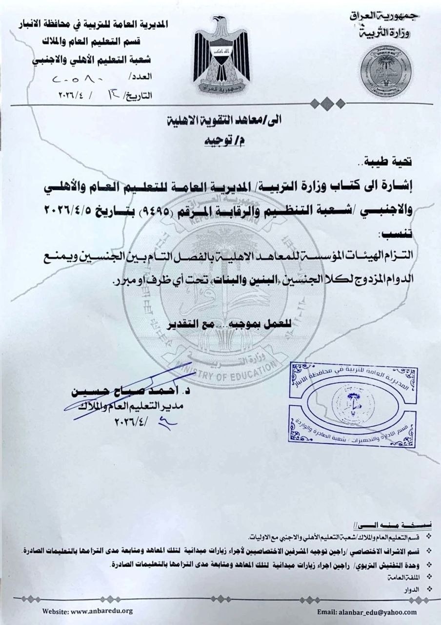 وجهت مديرية تربية الأنبار، اليوم الثلاثاء، ( 14 نيسان 2026 )، معاهد التقوية الأهلية بالفصل التام بين الذكور والإناث.