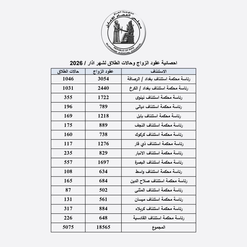أعلن مجلس القضاء الأعلى، اليوم الأربعاء ( 15 نيسان 2026 )، إحصائية الزواج والطلاق لشهر آذار في عموم العراق.