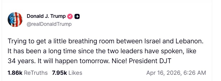 أكد الرئيس الأمريكي دونالد ترامب، اليوم الخميس ( 16 نيسان 2026 )، أن جهوداً تُبذل حالياً لـ"توفير مساحة لالتقاط الأنفاس" بين إسرائيل ولبنان، في ظل التصعيد المستمر على الحدود بين الجانبين.