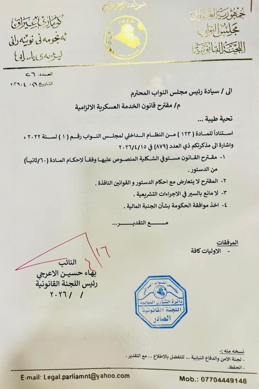 أكد رئيس اللجنة القانونية في مجلس النواب، بهاء الأعرجي، اليوم الخميس ( 16 نيسان 2026 )، أن مقترح قانون الخدمة العسكرية الإلزامية مستوفٍ لجميع المتطلبات الشكلية المنصوص عليها في الدستور العراقي، ولا يتعارض مع القوانين النافذة.