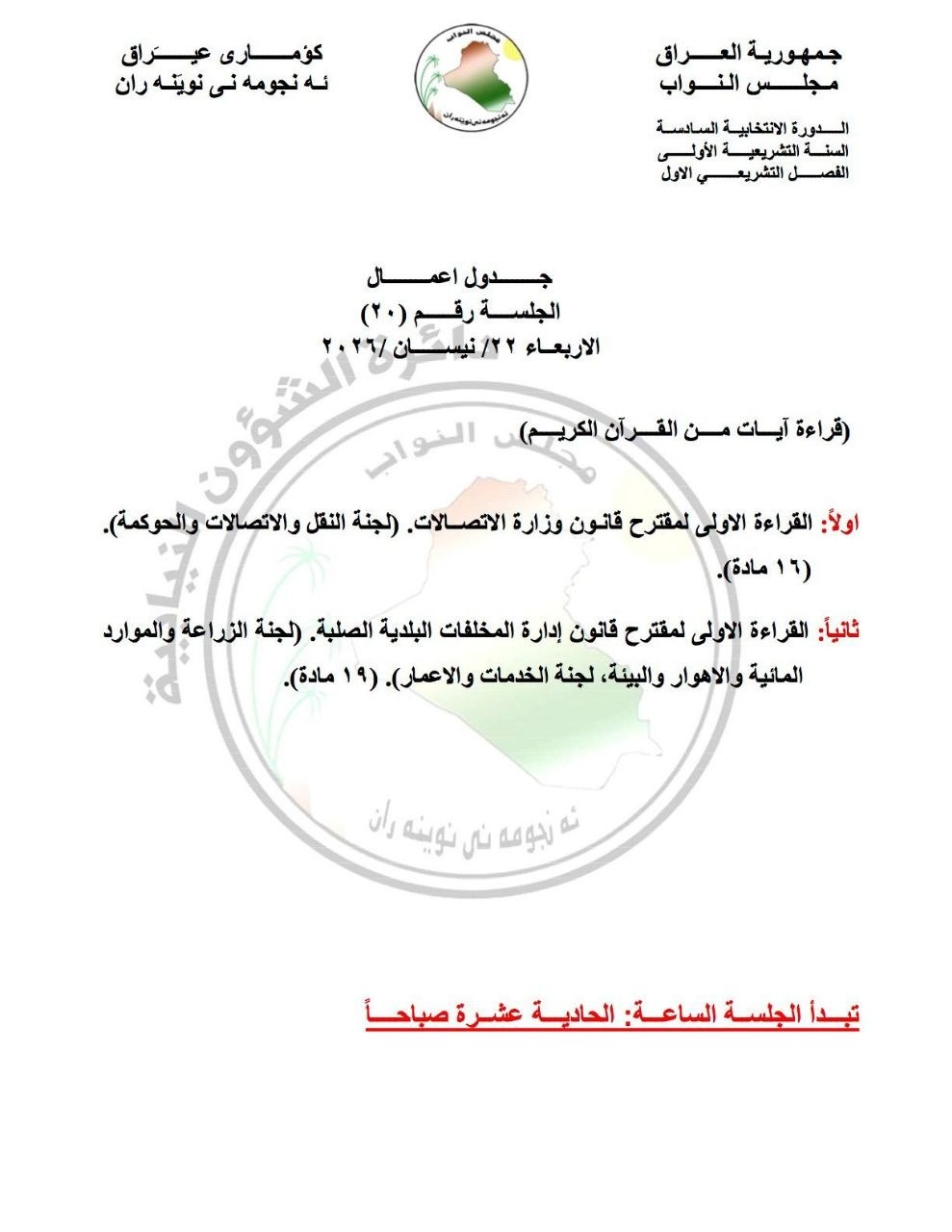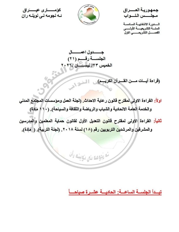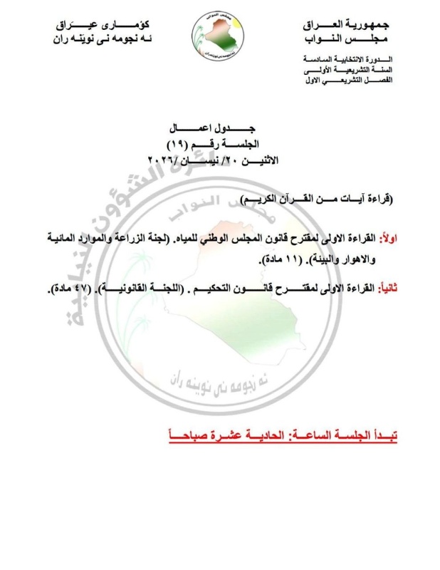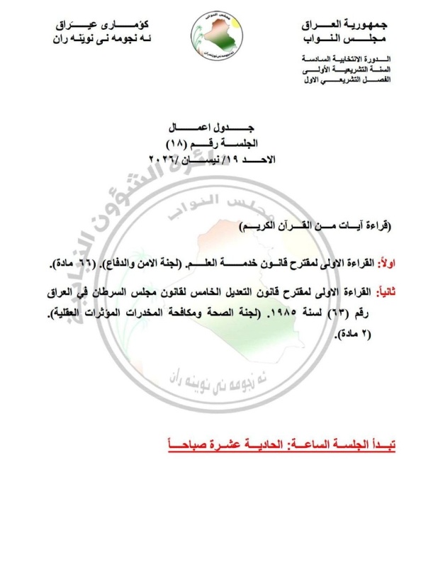 أعلن مجلس النواب، اليوم الجمعة، ( 17 نيسان 2026)، جداول أعمال أربع جلسات نيابية مقبلة خلال الأسبوع المقبل.
