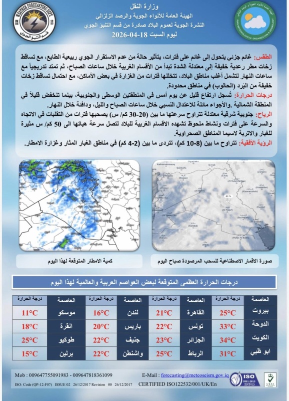 توقعت هيئة الأنواء الجوية، اليوم السبت ( 18 نيسان 2026 )، أن يكون الطقس غائماً جزئياً غير مستقر ربيعي الطابع مع تساقط زخات مطر رعدية خفيفة مع احتمال تساقط زخات خفيفة من البرد (الحالوب) في مناطق محدودة، بينما ترتفع درجات الحرارة في المنطقتين الوسطى والجنوبية، فيما تنخفض قليلاً في المنطقة الشمالية.