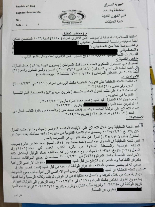 وحصلت "بغداد اليوم" على وثائق جاء فيها أنه، على خلفية شكوى تقدم بها المواطن (باترون انويا بوتان)، فإن رئيس قسم الأراضي الزراعية في مديرية زراعة بغداد، نبيل حسن عبد الله، امتنع عن إكمال إجراءات نقل العقد، رغم اكتمال الموافقات الرسمية وتقديم وكالة قانونية أصولية تخوّل الوكيل متابعة المعاملة.