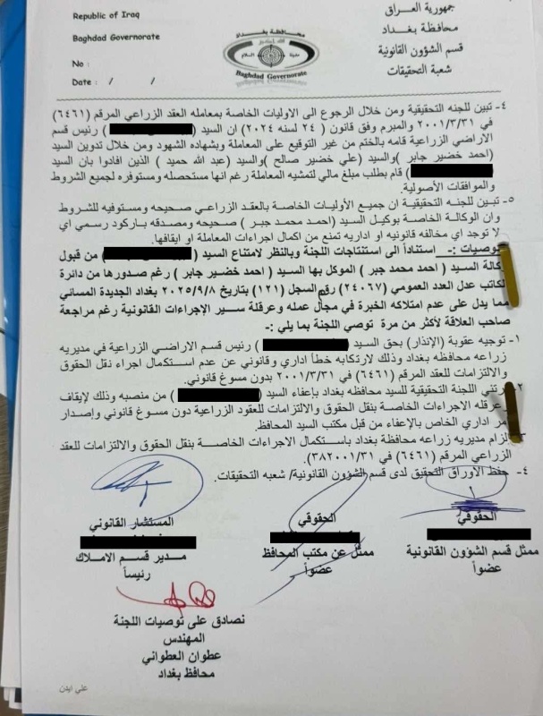 كشفت لجنة تحقيقية في محافظة بغداد عن وجود مخالفات إدارية خطيرة رافقت إجراءات نقل حقوق عقد زراعي في منطقة جرف النداف، أبرزها طلب مبالغ مالية مقابل تمرير المعاملة، رغم استيفائها جميع الشروط القانونية.