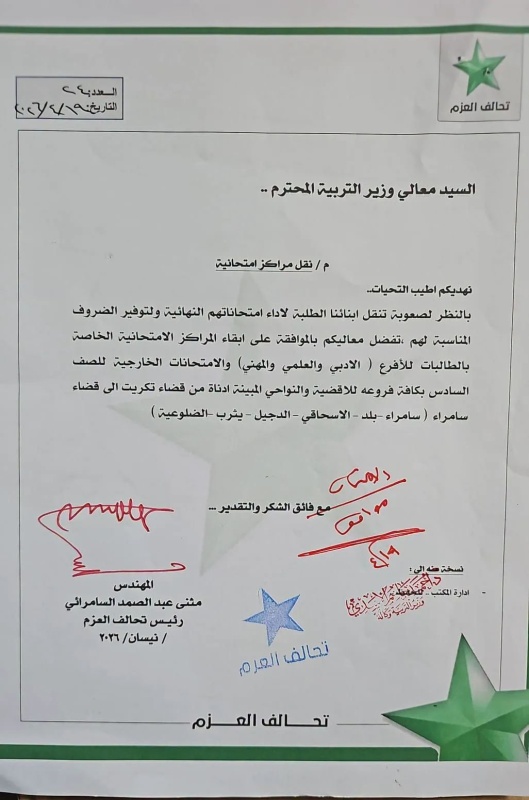 أعلن رئيس تحالف العزم مثنى السامرائي، اليوم الأحد ( 19 نيسان 2026 )، حصوله على موافقة وزير التربية على نقل المراكز الامتحانية من مدينة تكريت إلى أقضية ونواحي المحافظة.