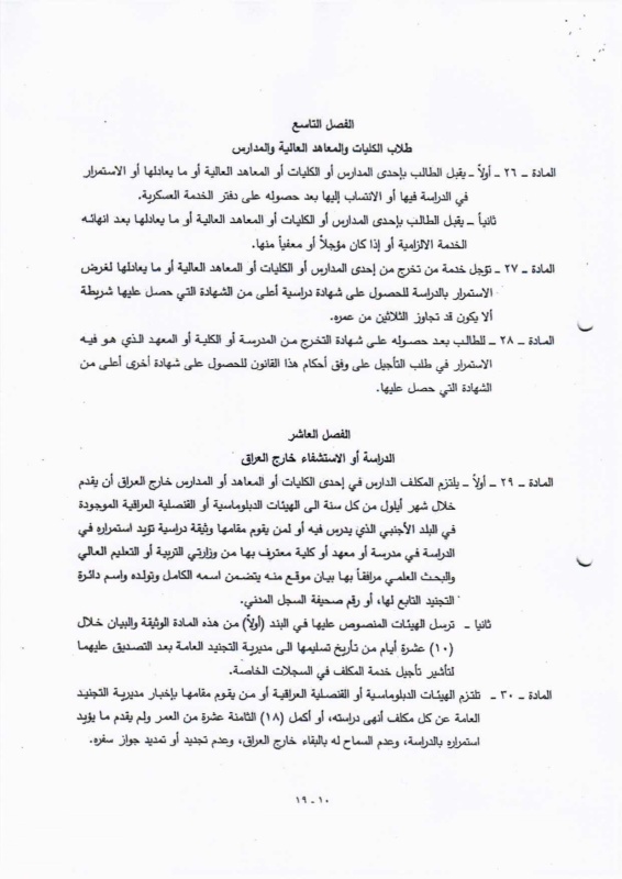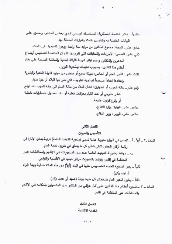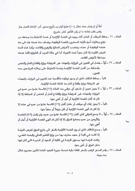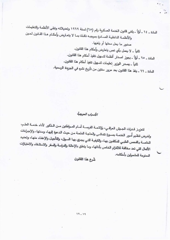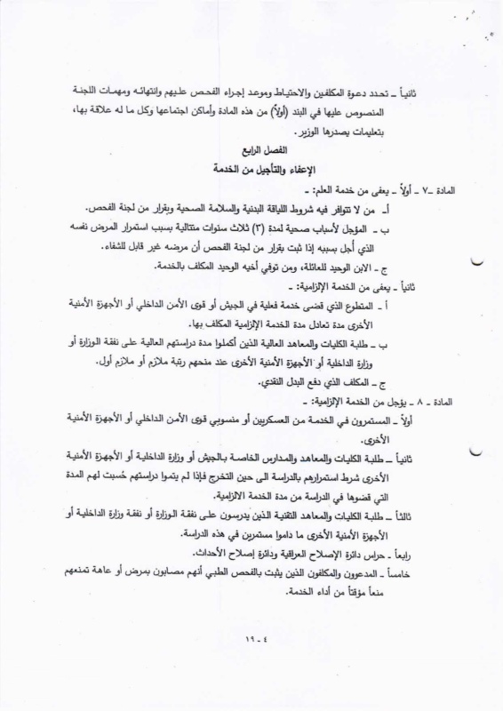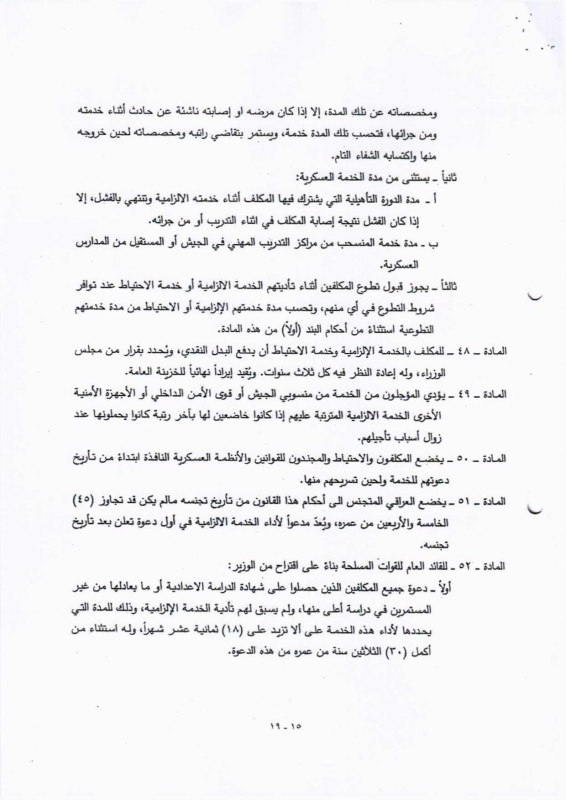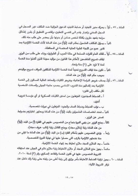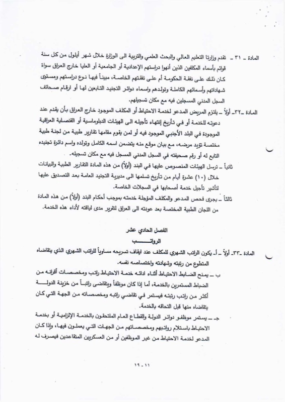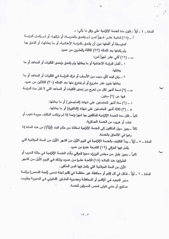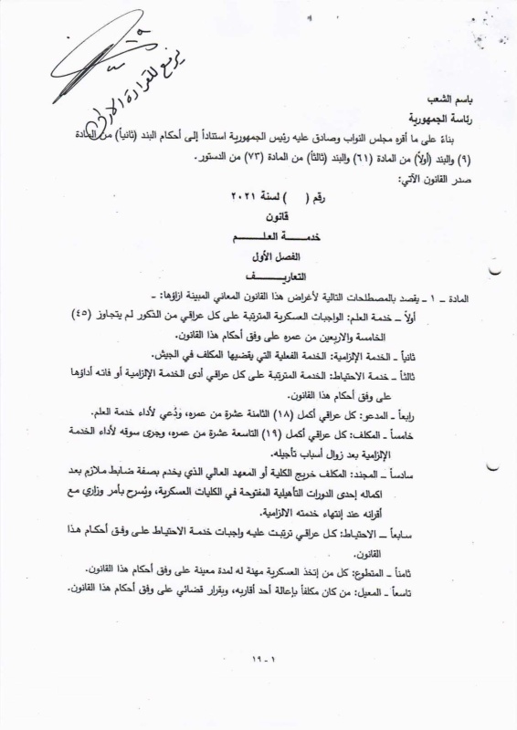تنشر "بغداد اليوم"، اليوم الأحد ( 19 نيسان 2026 )، النص الكامل لمقترح قانون خدمة العلم الجديد، الذي أُدرج ضمن أعمال مجلس النواب، والمتضمن إعادة تنظيم آليات الخدمة الإلزامية للمواطنين ضمن فئات عمرية محددة، وبما ينسجم مع متطلبات المؤسسة العسكرية والظروف الأمنية في البلاد.