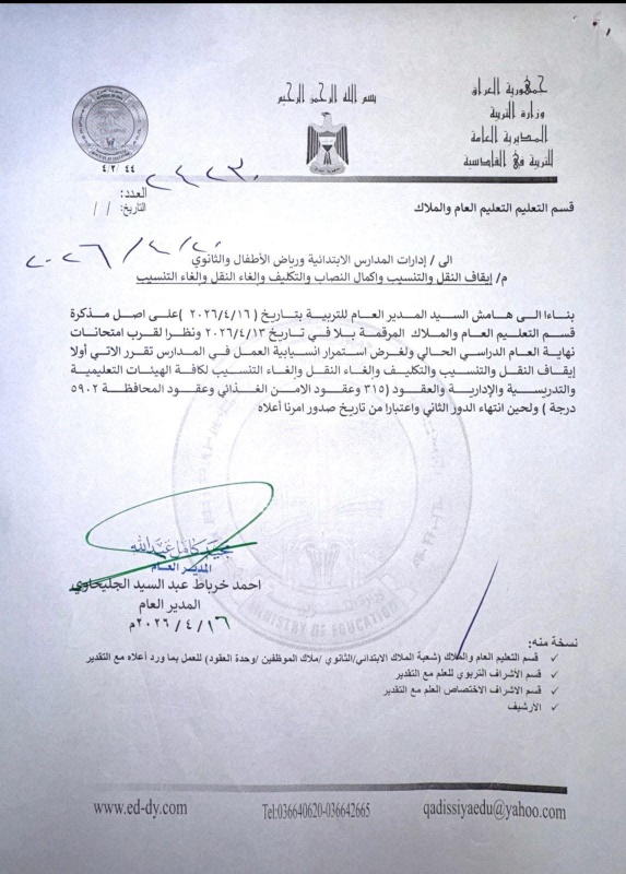 أعلنت وزارة التربية العراقية/ مديرية العامة للتربية في محافظة القادسية، اليوم الإثنين ( 20 نيسان 2026 )، عن حزمة توجيهات تنظيمية جديدة تتعلق بسير العمل في المؤسسات التربوية، تزامناً مع قرب انطلاق امتحانات نهاية العام الدراسي.