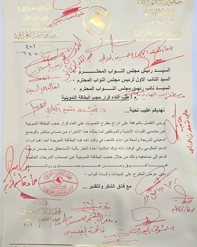 وأكدت المسلماوي في كتابها لرئاسة البرلمان، تلقته "بغداد اليوم"، أن "هذا الإجراء يمثل مساساً مباشراً بالوضع المعيشي لشريحة واسعة من أبناء الشعب،" مشيرة إلى أن "البطاقة التموينية تعد واحدة من أهم أدوات الدعم الحكومي في الوقت الراهن".