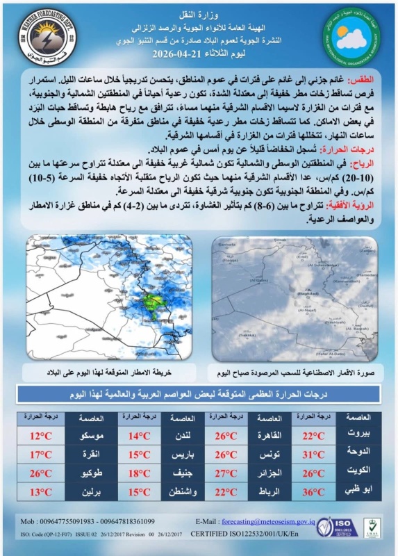 توقعت الهيئة العامة للأنواء الجوية، اليوم الثلاثاء ( 21 نيسان 2026 )، طقساً غائماً جزئياً مع فرص لأمطار خفيفة إلى معتدلة تكون رعدية أحياناً، وتشتد في المناطق الشرقية من الشمال والجنوب. كما تشهد المنطقة الوسطى زخات متفرقة نهاراً، مع انخفاض طفيف بدرجات الحرارة مقارنة بيوم أمس.