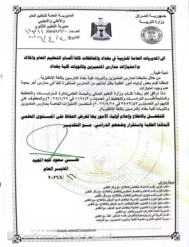 وبحسب وثيقة صادرة عن الوزارة، حصلت عليها "بغداد اليوم"، اليوم الأربعاء ( 22 نيسان 2026 )، وجهت الوزارة تعميماً إلى المديريات العامة للتربية في بغداد والمحافظات، أوضحت فيه متابعة حالات نقل بعض أولياء الأمور لأبنائهم من هذه المدارس بحجة عدم وجود امتيازات.