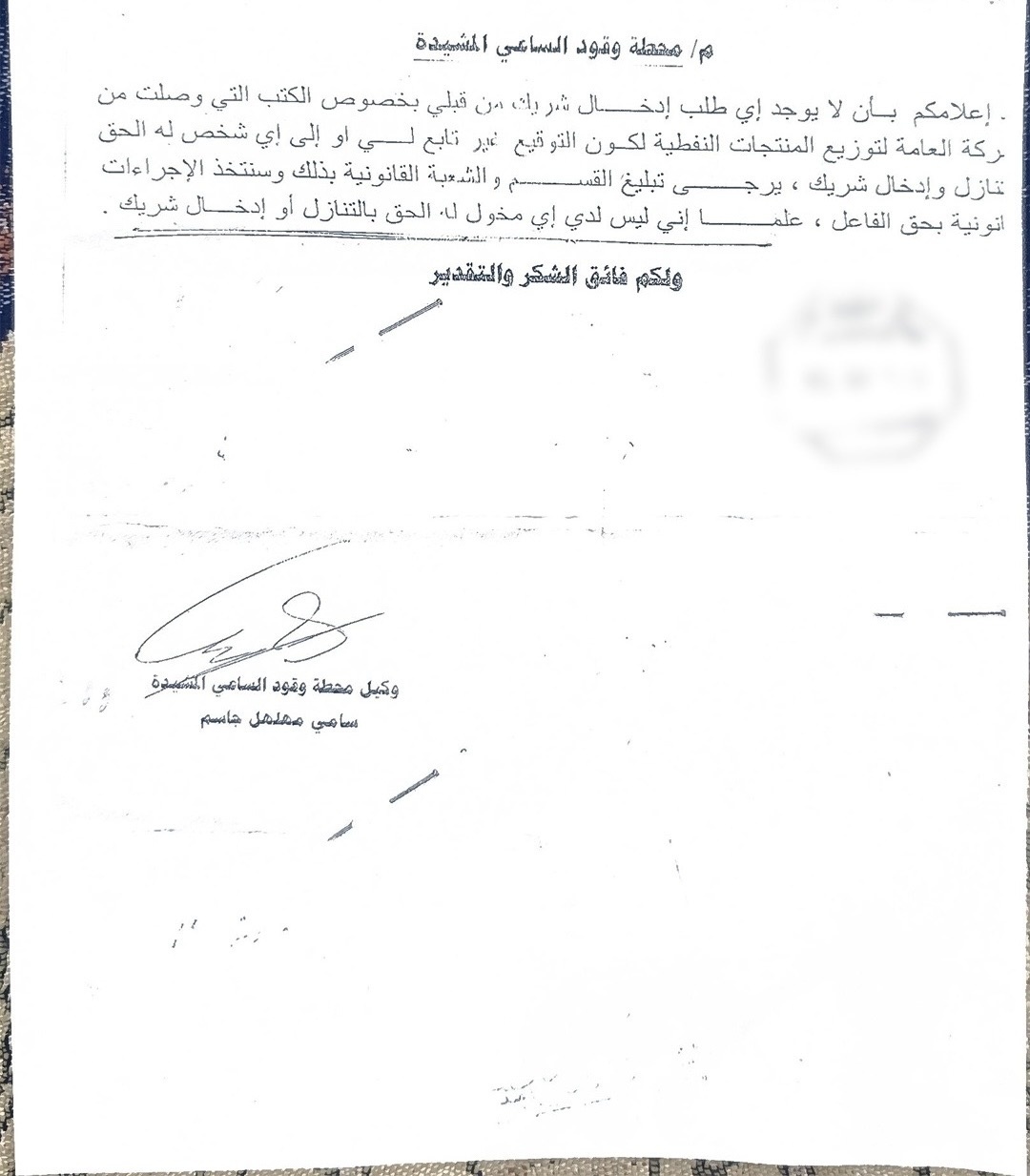 وفي المقابل، كشفت وثيقة أخرى صادرة عن وكيل محطة وقود الساعي المشيدة "سامي مهلهل، نفياً قاطعاً لوجود أي طلب من قبله لإدخال شريك.