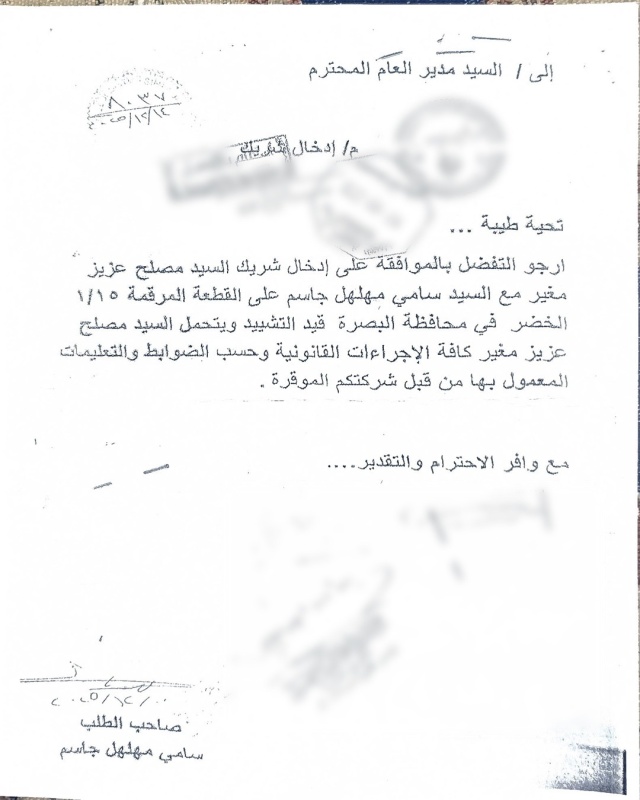 وتظهر الوثائق طلباً مقدماً باسم المدعو "مصلح عزيز مغير الزكم"، يدعي فيه الموافقة على إدخاله كشريك مع المالك الشرعي "سامي مهلهل" على القطعة المرقمة (1/15 الخضر) في البصرة، وهي الموقع المخصص للمحطة قيد التشيد.