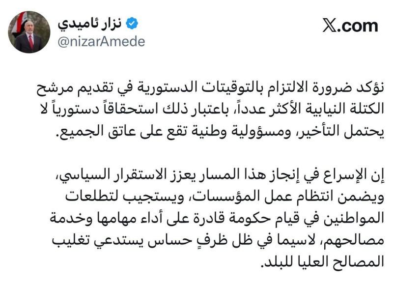 وقال ئاميدي في منشور على حسابه بمنصة (إكس):، إن "الإسراع في إنجاز هذا المسار يعزز الاستقرار السياسي، ويضمن انتظام عمل المؤسسات، ويستجيب لتطلعات المواطنين في قيام حكومة قادرة على أداء مهامها وخدمة مصالحهم".