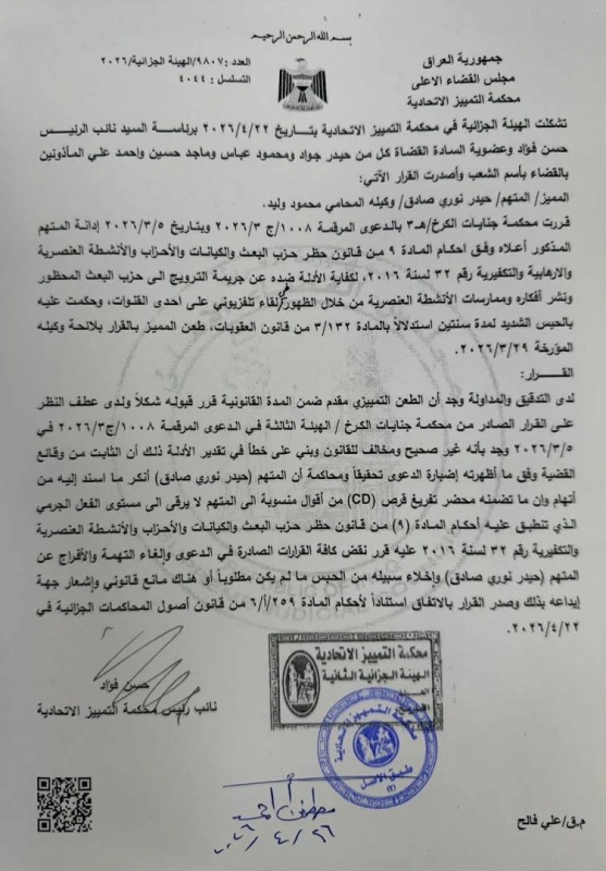 أصدرت محكمة التمييز الاتحادية، اليوم الأحد ( 26 نيسان 2026 )، قراراً بنقض حكم الإدانة الصادر بحق المتهم حيدر نوري صادق (حيدر الملا)، والإفراج عنه لعدم كفاية الأدلة القانونية.