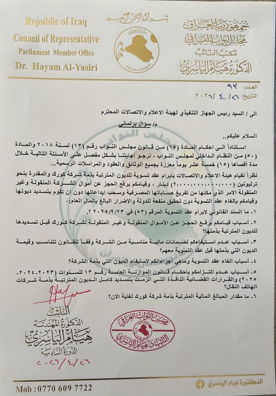 وجهت النائب هيام الياسري سؤالا برلمانيا إلى رئيس الجهاز التنفيذي لهيئة الإعلام والاتصالات، طالبت فيه بإيضاحات مفصلة حول ملف تسوية الديون المترتبة على شركة كورك للاتصالات، وما رافقه من إجراءات أثارت جدلا واسعا بشأن حماية المال العام.
