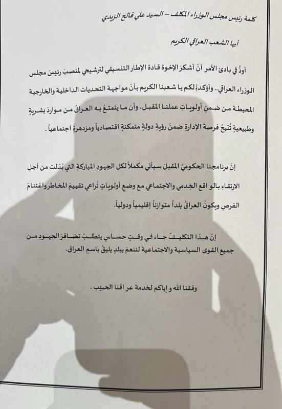 وقال الزيدي في كلمة وجهها إلى الشعب العراقي بمناسبة تكليفه لرئاسة الوزراء: إن "العراق يتمتع بموارد بشرية وطبيعية تتيح فرصة الإدارة ضمن رؤية دولة متمكنة اقتصادياً ومزدهرة اجتماعياً"، معرباً عن شكره لقادة الإطار التنسيقي لترشيحه لمنصب رئيس مجلس الوزراء.