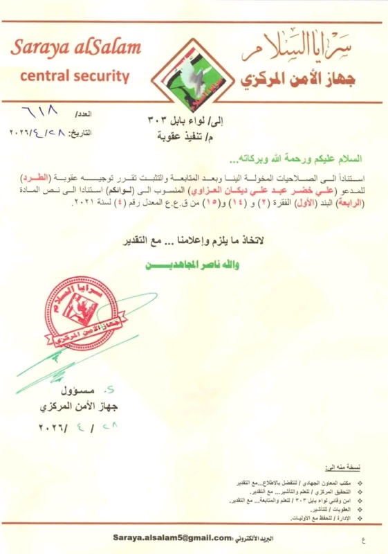 قررت القيادة العامة لسرايا السلام، اليوم الثلاثاء ( 28 نيسان 2026 )، طرد أحد عناصرها في محافظة بابل.