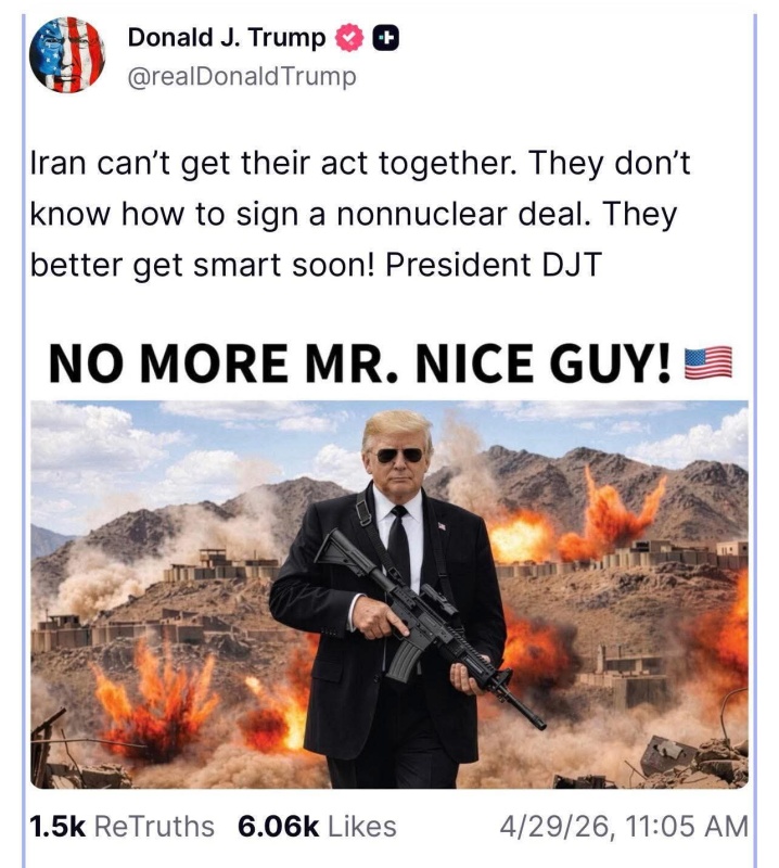 أكد الرئيس الأمريكي دونالد ترامب، اليوم الأربعاء ( 29 نيسان 2026 )، أن "زمن الرجل الهادئ قد انتهى"، مبيناً أنه يجب على إيران أن تقرر بحكمة.